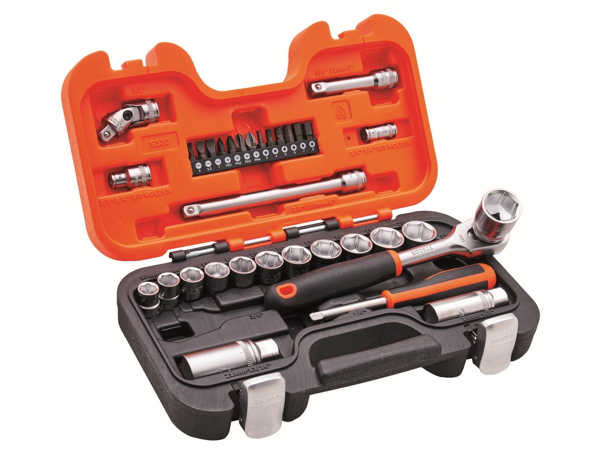 The XMS S330 34 Piece 3/8in Square Drive Socket Set, made by Bahco, contains 12 excellent metric hex sockets made from high performance alloy steel. This must have XMS deal is made with a Dynamic Drive™ profile to protect the sockets from wear and damage, giving you long lasting quality and reliability for your money. The contoured design makes the Bahco set substantially better for holding and handling. To complete this socket set are 6 accessories, 3/8in 60-tooth ratchet, 13 bits, a bit holder and a spinner handle. All of this Bahco set is supplied in an oil and temperature resistant polypropylene case. Conforms to DIN 3120 / ISO 1174. Just look at what you are getting, the set contains: 12 x 3/8in Hex Sockets: 10, 11, 12, 13, 14, 15, 16, 17, 18, 19, 20 & 22mm. 1 x 3/8in 60 Teeth Quick Release Ratchet. 2 x 3/8in Extension Bars: 75mm (3in) & 150mm (6in). 1 x 3/8in Universal Joint. 1 x 3/8in x 1/4in Bit Holder. 2 x 3/8in Spark Plug Sockets Hex: 16mm (5/8in) & 21mm (13/16in). 1 x 1/4in Spinner Handle, 2-Component Handle. 1 x 1/4in x 1/4in Bit Holder. 3 x 1/4in Slotted Bits: 4, 5.5 & 7mm. 4 x 1/4in Phillips Bits: PH1, PH2, PH3 & PH4. 6 x 1/4in Hex Bits: 3, 4, 5, 6, 7 & 8mm.