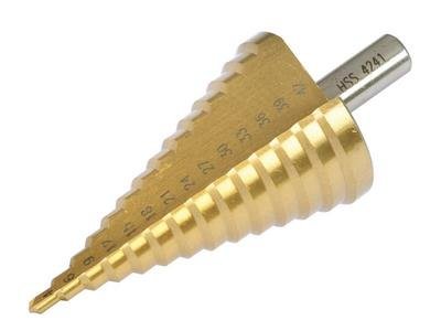 The BlueSpot HSS Step Drill is manufactured from high-speed steel for increased durability and cutting power. With 14 Steps: 2mm (4-6mm) and 3mm (9-42mm) increments. Titanium coated to reduce friction and heat. Specially designed for precision drilling of holes in aluminium, brass, copper, plastic, steel and wood.