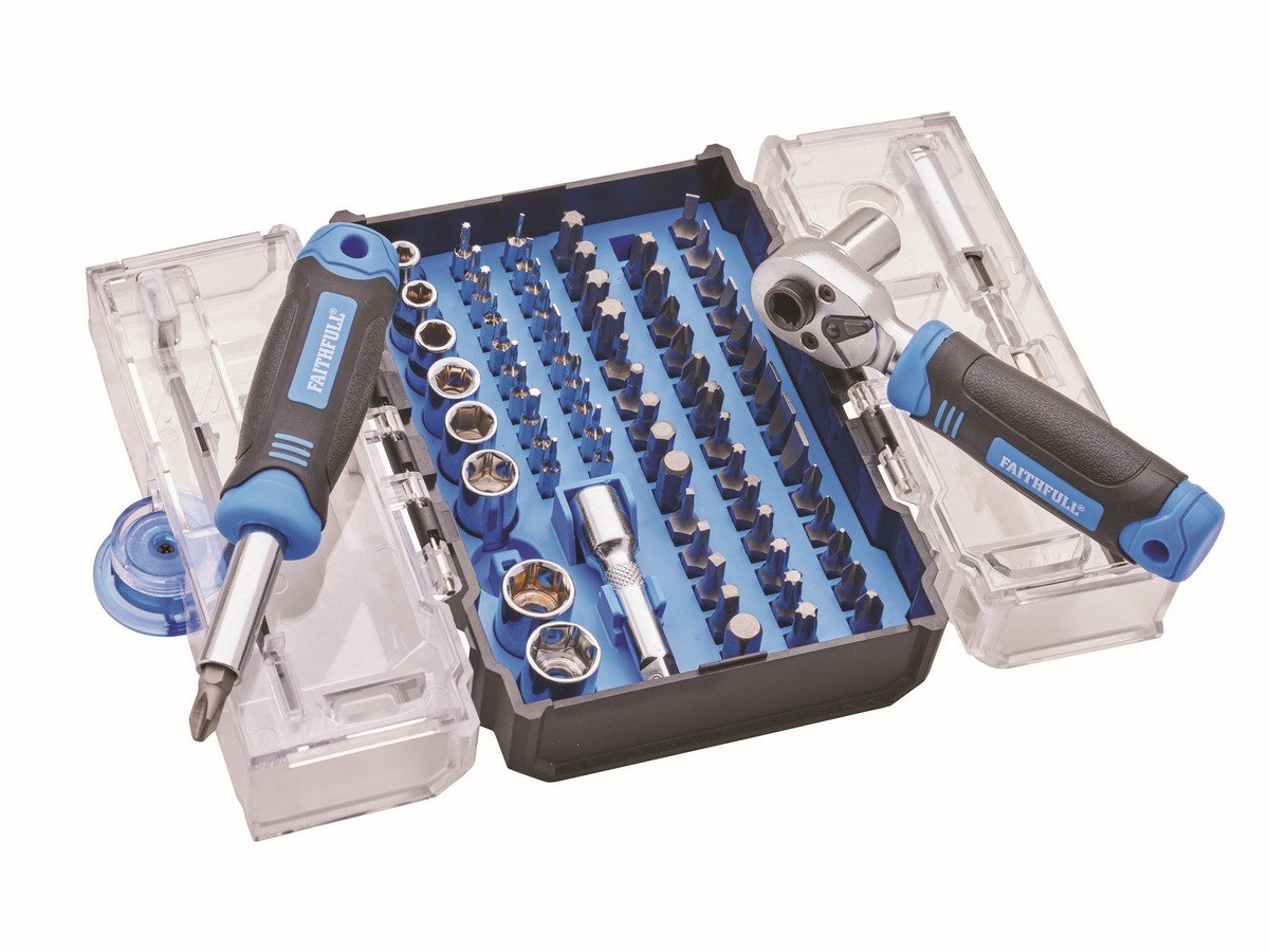 The New & Exclusive XMS Screwdriver Bit & Socket Set, 78 Piece from Faithfull will sell quickly so make your Get Kitted Out request now! Contains: 48 tooth ratchet handle. 9 sockets (5 to 13mm). 62 screwdriver bits (SL, PZ, PH, TX, Hex).