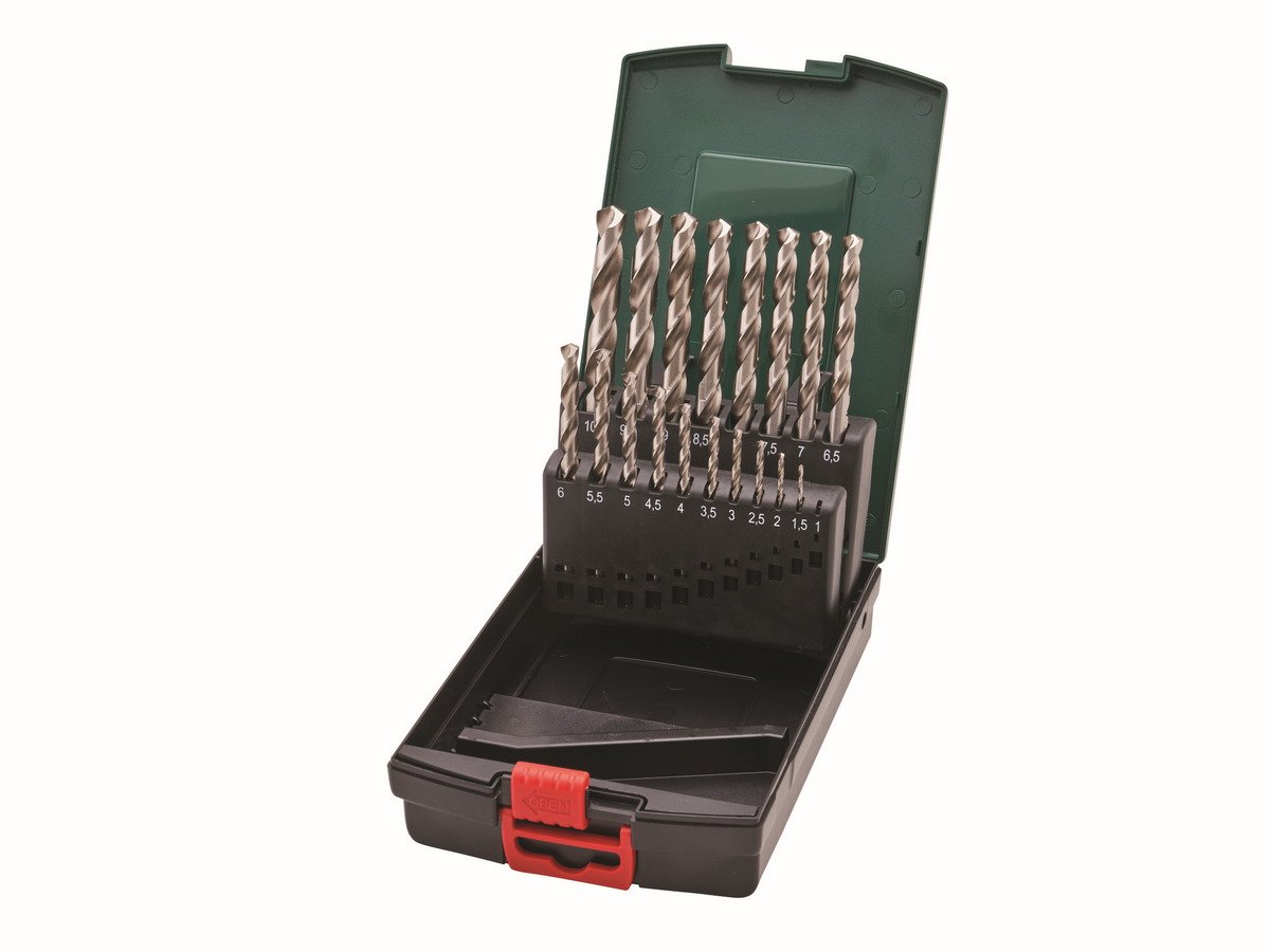 The XMS HSS Drill Bit Set, 19 Piece, in Case, made by Metabo© – a superb set for GKO listing, great value.. HSS-G Metal drill bits, ground version, cylindrical, DIN 338, type N, 135 degree crosswise grinding, blank surface, 19 pieces, in plastic carry case. diameter 1 – 10 x 0.5 mm; Suitable for drilling steel and cast steel, alloyed and unalloyed, grey cast iron, malleable cast iron, ductile cast iron, sintered iron, nickel silver, graphite, non-ferrous metals, plastic; Up to 900 N/mm² tensile strength.