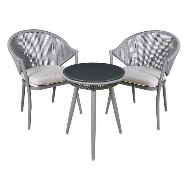 • SET INCLUDES – 2 Chairs and tempered glass top table. Supplied with 5cm thick seat cushions.