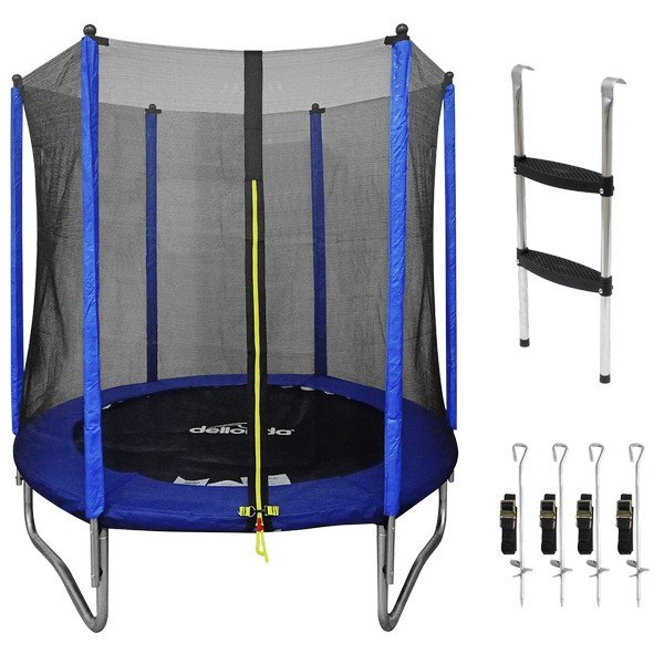 • SAFETY FIRST – PVC and PE covered EPE foam surround to protect children from accidentally landing on the springs. Fitted with PE safety enclosure net with zip entrance door to limit risk of injury. Tested and approved to EN71. Anchor kit and wide step ladder for further safety.