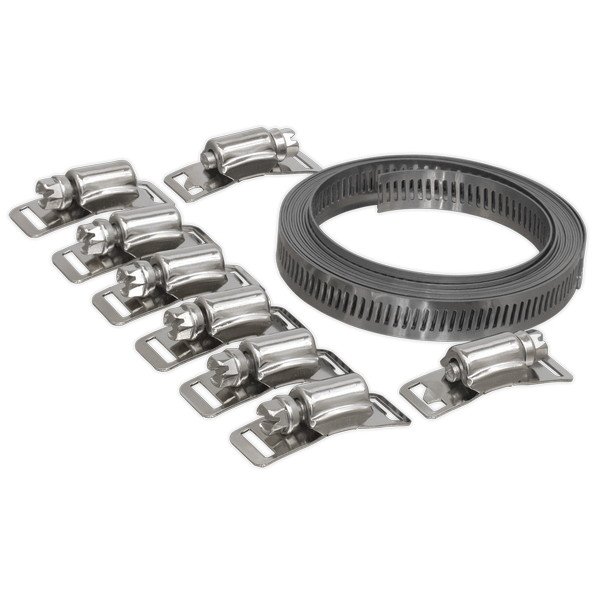 • Set includes a length of banding and a selection of worm drive tension clips.