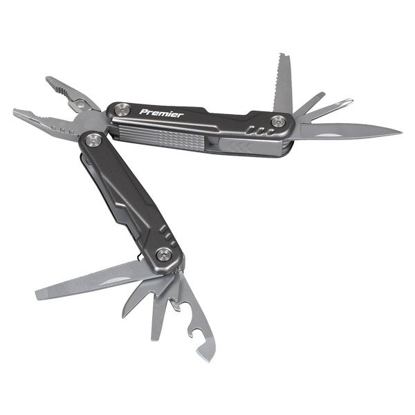 • 14 TOOLS IN ONE – Functions include: 1. Long Nose Pliers, 2. Combination Pliers, 3. Wire Cutter, 4. Large Slotted Screwdriver, 5. Double File, 6. Leather Punch, 7. Medium Slotted Screwdriver, 8. Can Opener, 9. Bottle Opener, 10. Hook Remover, 11. Fish Scaler, 12. Small Slotted Screwdriver, 13. Phillips Screwdriver, 14. Knife.