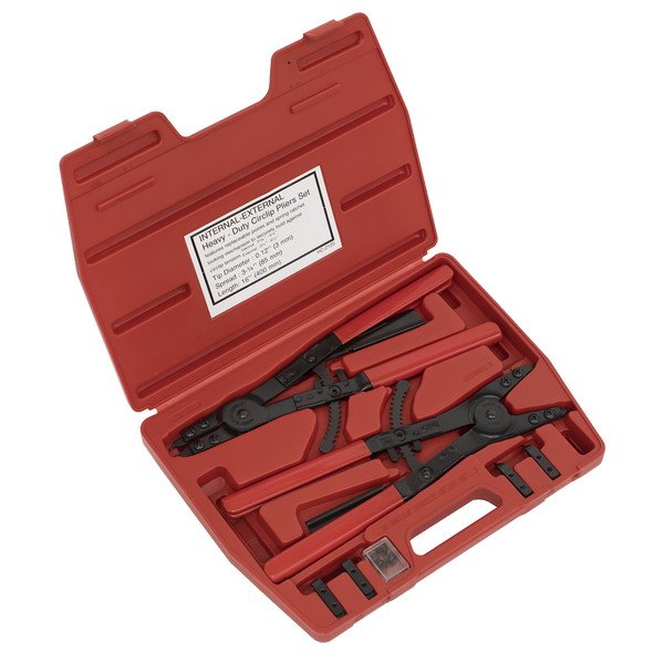 • Internal and external circlip pliers with spring ratchet locking mechanism to securely hold against circlip tension.