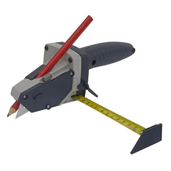 • Can either use pencil for marking or retractable blade for cutting.