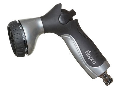 The Flopro Professional Multi Spray Gun is made from zinc alloy, ABS and TPR. Fitted with a silver chrome male adaptor for enhanced durability. Perfectly weighted and balanced for ergonomic handling. The water flow is fully adjustable with one hand. Ideal for both cleaning and irrigation. It has 8 spray patterns: Cone, Mist, Stream, Full, Centre, Shower, Flat and Vertical.