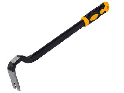 The Roughneck Roofing Gorilla Bar (TM) features a double injection moulded soft-grip handle. Manufactured from drop forged, heat treated alloy steel for exceptional strength and durability. Wide low profile jaws and a flattened striking face allows for the bar to be driven deeper underneath the work piece for more effective prying. Powder coated finish offers greater resistance to corrosion. With bevelled nail removers for prying embedded nails.