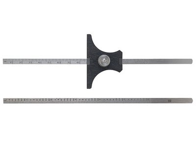 The Moore & Wright 43 Reversible Base Depth Gauge has the following specification: Size of Base: 18/56mm, 0.71/2.21in. Width: 5.5mm/0.22 Inch. Thickness: 1.0mm/0.04in. Length of Blade: 195mm/7.68in. Metric/Imperial Scale Graduations : Front Face: 1/32nd, Rear Face: 1.0mm.