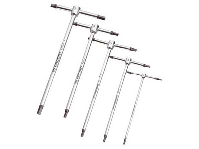 The Facom 84TC.JE5 84TC.JE5 Set of 5 T Spinner Hexagon Keys, each with 3 Hexagon ends and a burnish-tipped chrome finish. Contains sizes: 3, 4, 5, 6 and 8mm.