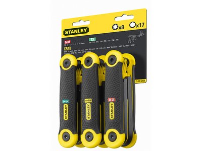 Folding hexagon, metric, imperial and torx key sets with bi-material grips for increased comfort. Chamfered tip to aid location. Phosphate finish for corrosion protection. 8-piece metric, 9-piece imperial and 8-piece Torx set comprising: 1.5, 2, 2.5, 3, 4, 5, 6 and 8mm. 5/64, 3/32, 7/64, 1/8, 9/64, 5/32, 3/16, 7/32 and 1/4in. T9, T10, T15, T20, T25, T27, T30 and T40.