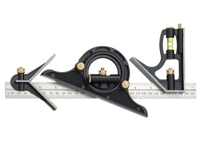 A versatile measuring instrument with matt black die cast stock, brass locking screw and stainless steel blade with markings clearly etched on both sides, fitted with separate scriber. Also fitted with a steel blade, centre head and protractor set.