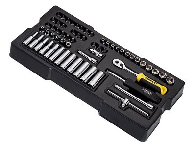 Part of the Stanley Tools Transmodule System, a modular mechanics storage system ideal for the workshop. Designed to use with compatible Transmodule system storage cabinets. All the sockets feature Maxi Drive, that helps reduce fastener rounding and are made from Chrome Vanadium Steel. The bit sockets are made from S2 steel, HRC 60 ±2 with a 20% higher torque than CrV. The extensions are also made from Chrome-Vanadium steel with a full polished finish. The ratchet features a socket safety lock and a reverse lever with rotation direction displayed. Made from Chrome-Vanadium steel and fitted with a chemical resistant, ergonomic bi-material handle and quick release button. Contains the following: 13 x Standard Sockets: 4, 4.5, 5, 5.5, 6, 7, 8, 9, 10, 11, 12, 13 & 14mm. 12 x Deep Sockets: 4, 5, 5.5, 6, 7, 8, 9, 10, 11, 12, 13 & 14mm. 3 x Slotted Bit Sockets: 4, 5.5 & 7mm. 3 x Pozidriv Bit Sockets: PZ1, PZ2 & PZ3. 3 x Phillips Bit Sockets: PH1, PH2 & PH3. 6 x Hex Bit Sockets: 2, 2.5, 3, 4, 5 & 6mm. 8 x Torx Bit Sockets: T6, T7, T8, T9, T10, T15, T20, T25. 6 x Torx Sockets: E4, E5, E6, E7, E8, E10. 2 x Extension Bars: 50 & 100mm. 1 x Universal Joint. 1 x Quick Release Ratchet. 1 x Sliding Tee. 1 x Driver Handle. 1 x NP9 Pear Headed Ratchet.