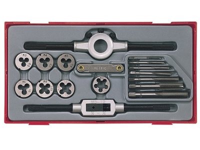 This Teng Tools tap and die set is ideal for repairing screw threads. Taps cut a thread on the inside surface of a hole, creating a female surface which functions like a nut. Dies, on the other hand, cut a thread on a preformed cylindrical rod, which creates a male threaded piece which functions like a bolt. This 17-piece set contains 7 metric taps and dies of each dimension, a tap wrench, a die stock and a screw pitch gauge. The tools are supplied in a handy storage tray. The TTTD17 tap and die set contains the following: 7 x Metric dies: 3 x 0.5mm, 4 x 0.7mm, 5 x 0.8mm, 6 x 1.0mm, 8 x 1.25mm, 10 x 1.5mm and 12 x 1.75mm. 7 x Metric taps: 3, 4, 5, 6, 8, 10 and 12mm. 1 x Tap handle: capacity 3 to 12mm. 1 x Die handle with adjustment screw: capacity 3 to 12mm. 1 x Screw pitch gauge.