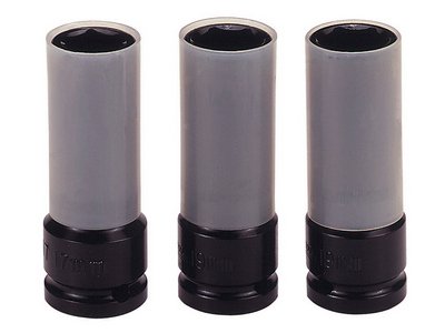 The Teng 9203N Wheel Nut Socket Set contains a selection of 1/2in drive, 6-point deep metric impact sockets, made from chrome molybdenum with a black finish and protective inserts. To be used for wheel nuts, ideal for use on aluminium wheels. Supplied as a set of 3: 17, 19 & 21mm.