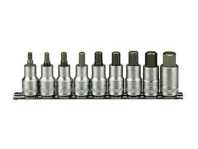 This Teng Tools 9-piece set consists of 1/2-inch drive hexagon bit sockets for internal heads. The bit sockets are manufactured from chrome vanadium steel for strength and durability and have a satin chrome finish. They are supplied on a clip rail, which is ideal for both wall mounting and for use in a toolbox. The set comprises the following bit socket sizes: 5mm, 6mm, 7mm, 8mm, 9mm, 10mm, 12mm, 14mm and 17mm and 1 clip rail 220mm length.