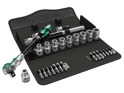 The Wera 28 Piece 8100 SC 6 Zyklop Speed Ratchet Ratchet & Socket Setcontains a mixture of 1/2in sockets, extensions, bits and a ratchet. Perfect for a variety of jobs and tasks. The 8000 B Zyklop Speed Ratchet is suitable for 1/2in square sockets and 1/2in adaptors with square drive and is equipped with a ball lock. The flywheel design and easy-to-grip free-turning sleeve allow for faster work. There is a swivel ratchet head with defined lock positions at 0° and 90 degree to the left and right. It can be used like a conventional screwdriver, push button release, left/right switchover, fine-tooth design, small return angle of 5 degree. Supplied in a robust, textile case. Contains: 1 x 1/2in 8000 C Zyklop Speed Ratchet. 10 x 1/2in Zyklop Sockets: 10, 11, 12, 13, 14, 15, 16, 17, 18 & 19mm. 2 x 50mm TZ Phillips Bits: PH1, PH2. 2 x 50mm TZ Pozidriv Bits: PZ1, PZ2. 6 x 50mm TZ TORX Bits: TX20, TX25, TX30, TX40, TX45 & TX50. 4 x 50mm Z Hex Bits: 5, 6, 8, 10mm. 1 x 1/2in Extension With Free-Spinning Sleeve: 150mm. 1 x 1/2in Wobble Extension: 56mm. 1 x 1/2in Square to 5/16in Hex Adaptor.