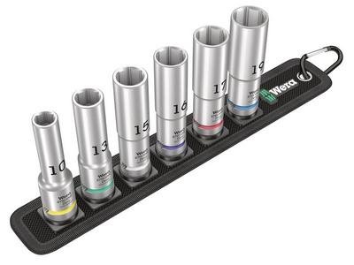 The Wera Belt C Deep 1 Socket Set for external hexagonal bolts and sockets. This deep socket set is perfect for use with protruding threaded rods and low-lying bolts and sockets. Incorporating an off-point profile-preserving hexagonal profile, these sockets are designed for intensive use and are also guaranteed for production use with nonimpact power tools. Knurling at the base, for easy gripping even with oily hands. They also feature the handy Take-it-easy tool finder colour coding system for fast and easy selection of the required size, thanks to the instantly recognisable colour coded system. Supplied on a robust textile belt, with a smooth Twist to Unlock mechanism that ensures secure storage and simple removal of the bit sockets. It also comes with a nonwoven reverse side and hook & loop strips for simple attachment, e.g. to a wall, shelf, tool trolley and to the Wera 2go tool transport system. Contains: 6 x 83mm 8790 HMC Deep Sockets: 10, 13, 15, 16, 17, 19mm Specification: Socket Rail C (textile belt): 45 x 275mm Hook & Loop Fastener Strip: 200 x 30mm