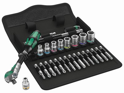 The Wera 28 piece compact Ratchet & Socket set contains a 1/4in Speed ratchet, inch size sockets and accessories. Ideal for those on the move, the high quality, structured fabric case is a sharp contrast to traditional heavy metal or bulky plastic boxes. The tools are securely arranged in a way that allows the case to be closed into a compact form, allowing it to become a constituent part of a tool box, not a separate item, and allows easy tool selection. The Wera Zyklop Speed ratchet, has a flywheel head design and freewheel spin-sleeve which increases operational speed of running fasteners up and down by up to 5 times. Its high precision gearing provides a small return angle of 5 degree from 72 teeth, allowing work in the most confined spaces. The unconventional ratchet design allows huge torque transfer capabilities, increasing service life and performance. The swivelling ratchet head offers five different positions that are lockable. It features press-button socket and accessory locking and release in any position, for complete tool security. It prevents accidental change of torque direction with the thumb wheel switch. The Kraftform multi-component handle is designed to deliver extra comfort during intensive use, especially when high torque is being trasnferred. The handle is impervious to all workshop fluids, and cannot detatch from the shaft. The locking bit adaptor cleverly allows the ratchet with the head in the 0° position to be used as a screwdriver. The Production Quality sockets are built to exceed the new ISO standard that offers the user the option to use them in battery, electric and air power tool applications as well as manual, hand operations, as long as impact is not used. A patented knurling around the socket base allows the finger rotation of free-running fasteners, even if coated in lubricant. Contains the following: 1 x 1/4in Drive Zyklop Speed Ratchet. 9 x 1/4in Zyklop Sockets: 3/16, 7/32, 1/47, 9/32, 5/16, 11/32, 3/8, 7/16, 1/2in. 3 x 50mm Phillips Bits: PH1, PH2, PH3. 2 x 50mm Pozidriv Bits: PZ1, PZ2. 6 x 50mm TORX Bits: TX10, TX15, TX20, TX25, TX27, TX30. 4 x 50mm Hex-Plus Bits: 5/32, 3/16, 7/32, 1/4in. 1 x 1/4in Square to Hex Adaptor: 37mm. 1 x 1/4in Extension With Free-Spinning Sleeve: 150mm. 1 x 1/4in Wobble Extension: 56mm.
