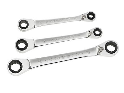 This Britool 3 Piece Quadbox Wrench set contains the following Quadbox wrenches: 1 x E110943B: 8-10 x 12-13mm. 1 x E110944B: 9-11 x 14-15mm. 1 x E111945B: 16-17 x 18-19mm. The wrenches are double ring, with a chrome finish. A switch to change ratcheting direction feature is built into the handle to prevent accidental change. Conform to ISO 1711-1 and ASME B107.66.