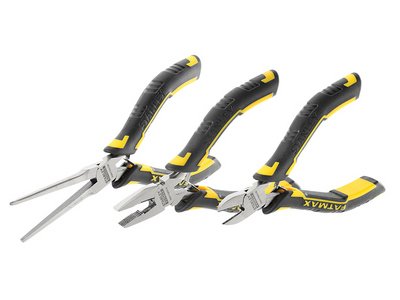 The Stanley Tools FatMax- Mini Pliers Set has been designed for both DIYers and tradesmen, to cover a wide range of applications. The pliers are made from high quality steel for strength and durability. Fitted with ergonomic bi-material handles that help to reduce slippage and fatigue. For safety, the handles incorporate a finger guard and an easy to use spring return. This set is ideal for use in the following type of applications: jewellery, zip tie cutting, wire cutting, stripping and gripping Supplied with one of each: 110mm Diagonal Cutter, 150mm Long Nose Pliers and 120mm Combination Pliers.