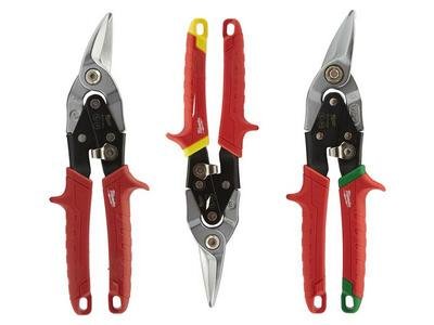 The Milwaukee Hand Tools Metal Aviation Snips are made from forged alloy steel (Cr steel) that is chrome plated for increased lifetime. Extra hardened to 65 HRC. Serrated cutting edges prevent slippage when cutting. Compound leverage action, the torsion spring opens jaws automatically during cutting for faster cutting action and less fatigue work. The handles feature ergonomic and durable overmoulded grips with thumb and forefinger slots for increased comfort and less fatigue. Allows user to push through sheet metal with ease with less risk of cutting oneself. Flush slimline design with a one-hand locking mechanism. Triple cutting direction identification: on the head, handle and by colour coded handle. Contains: 1 x Metal Aviation Snips Left Cut, 1 x Metal Aviation Snips Right Cut & 1 x Metal Aviation Snips Straight Cut. Specification: Edge Length: 31mm Max. Cutting Capacity: Aluminium 1.0mm; Stainless Steel 0.6mm; Steel 1.0mm Overall Length: 260mm Weight: 430g