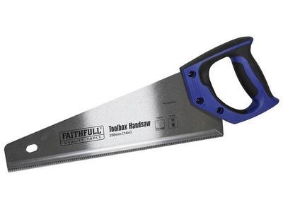 The Faithfull Toolbox Handsaw features a 350mm long blade making it ideal for storing in a toolbox. The 0.7mm thick, spring steel blade has been correctly hardened and tempered for strength and to minimise whip and vibration. Triple ground and hardened teeth offer fast cutting performance and excellent sawdust removal. The ergonomic, soft grip handle is designed to be comfortable for use over long periods and incorporates 90 degree and 45 degree angles for easy marking of the workpiece. Ideal for cutting hardwood, softwood, rough timber, board sheet and floorboards. Specification: Length: 350mm (14in) TPI: 16