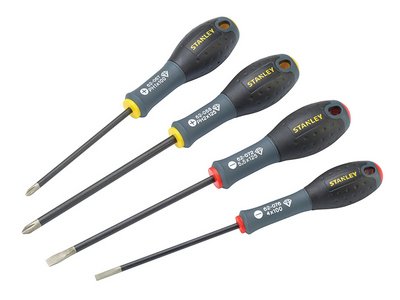 Stanley Diamond Tip Screwdrivers provide best-in-class grip on fasteners to reduce cam-out and prevent damage to the screw head. Their hardened, sand-blasted tips ensure long life and durability, and chrome vanadium steel bars resist bending and snapping. The screwdrivers have tri-material handles with TPR overlay for comfort and grip. Colour coded ends allow easy identification of the right screwdriver for each screw type. This set of 4 contains the following: 2 x Phillips: PH1 x 100mm and PH2 x 125mm. 1 x Flared slotted: 5.5 x 125mm. 1 x Parallel slotted: 4 x 100mm.