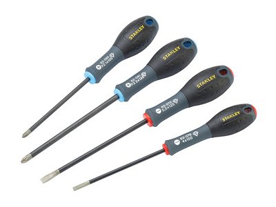 Stanley Diamond Tip Screwdrivers provide best-in-class grip on fasteners to reduce cam-out and prevent damage to the screw head. Their hardened, sand-blasted tips ensure long life and durability, and chrome vanadium steel bars resist bending and snapping. The screwdrivers have tri-material handles with TPR overlay for comfort and grip. Colour coded ends allow easy identification of the right screwdriver for each screw type. This set of 4 contains the following: 2 x Pozi: PZ1 x 100mm and PZ2 x 125mm. 1 x Flared slotted: 5.5 x 125mm. 1 x Parallel slotted: 4 x 100mm.