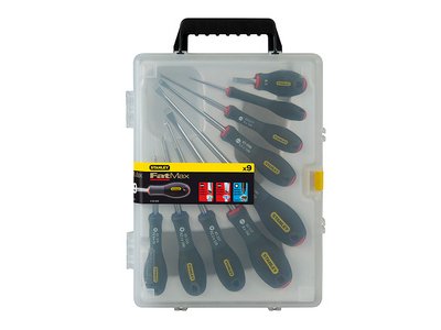 The Stanley screwdrivers in this set have large diameter handles which allow excellent torque for driving wood screws. These handles have soft grips which offer the perfect combination of great grip plus reduced fatigue. The smooth domed end enables fast spinning action. The blades of the screwdrivers are made from chrome vanadium steel for strength and reduced risk of tip breakage. The handle is moulded directly to the blade for a virtually unbreakable bond. Colour coded ends make it easy to indentify the correct screwdriver for each screw type. This set contains the following screwdrivers: 3 x Parallel slotted: 3x50mm, 4x100mm and 6.5x30mm. 3 x Flared slotted: 5.5x100mm, 6.5x150mm, 8x150mm. 3 x Pozi: PZ0x75mm, PZ1x100mm, PZ2x125mm.