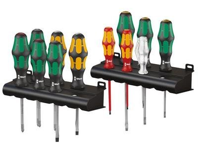 The Wera Kraftform XXL screwdriver set, which features the most popular sizes and types of each range. Includes general purpose, electricians VDE and heavy-duty chiseldrivers. Includes 2 free wall-mountable screwdriver storage racks. Contents: 3 x Lasertip Flared Slotted: 4.0 x 100mm, 5.5 x 125mm and 6.5 x 150mm. 2 x Lasertip Phillips: PH1 x 80mm and PH2 x 100mm. 2 x Lasertip Pozidriv: PZ1 x 80mm and PZ2 x 100mm. 2 x VDE Lasertip Slotted: 2.5 x 80mm and 3.5 x 100mm. 2 x Chisel Driver Slotted: 5.5 x 100mm and 7 x 125mm. 1 x Voltage Tester: 3.0 x 70mm.