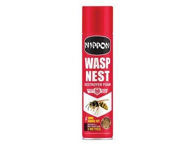 Nippon Wasp Nest Destroyer Foam controls wasps in and around the home. This powerful aerosol will destroy a wasp nest from a distance of over 3m. The spray foams up instantly to thoroughly wet the treated nest. Fast acting with rapid effect on contact. Contains permethrin and tetramethrin. Apply at the first signs of wasp activity. How to Use: Spray in early morning or late evening when the wasps are in the nest. Hold the can upright 3m away from the nest and spray in 3 second bursts to thoroughly wet the nest. Pay particular attention to the nest entrance or where the wasps are seen entering and leaving. A repeat application may be required where the entrance is not readily accessible. Note: If using on painted surfaces, test before use for discolouration before carrying out overall application. Nippon Wasp Nest Destroyer produces a temporary foam coating on the target surface. This would normally disperse after a few minutes.