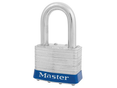 The Master Lock 5KALF-A118 has the following specifications: 51mm laminated steel padlock – 38mm hardened steel long shackle, 8mm diameter – 4-pins – keyed alike