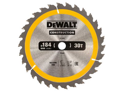 This Dewalt Construction Circular Saw Blade is for the cutting of rough timber, possibly with embedded nails. Specification: Blade Diameter: 184mm Blade Bore: 16mm Tooth Count: 30 Plate Thickness: 1.7mm Kerf Thickness: 2.6mm Grind Type: ATB Rake Angle: +10°