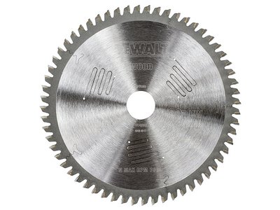 The Dewalt DT4350 Series 60 Circular Saw Blade for smooth cross-cuts in plywood, softwood and all hardwoods. The alternate top bevel and triple chip grind geometry with tuned grinding angles give a good surface finish. It has the following specification: Finish: Extra Fine. Blade Diameter: 216mm. Bore Size: 30mm. Tooth Count: 60. Plate Thickness: 1.8mm. Kerf Thickness: 2.6mm. Grind: ATBN. Rake Angle: -5 degree.