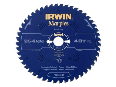 *** PRODUCT DISCONTINUED *** This Irwin Marples Mitre Circular Saw Blade has the following specifications: Blade Diameter: 254mm. Bore: 30mm. Teeth: 48. Kerf Thickness: 2.5mm. Tooth Config: ATB/Neg. Machine: Mitre.