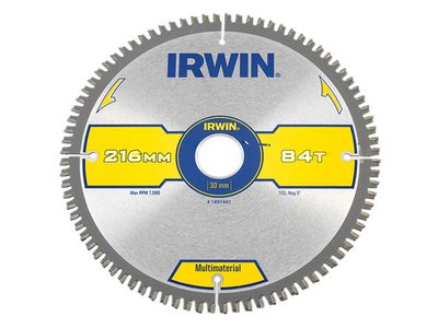 This Irwin Multi Material Circular Saw Blade has the following specifications: Blade Diameter: 216mm. Bore: 30mm. Teeth: 84. Kerf Thickness: 2.5mm. Tooth Config: TCG.