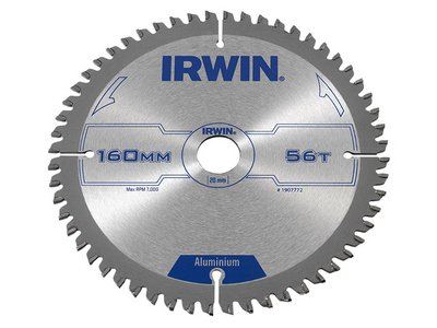 This Irwin Professional Aluminium Circular Saw Blade has the following specifications: Blade Diameter: 160mm. Bore: 20mm. Teeth: 56. Kerf Thickness: 2.5mm. Tooth Config: TCG.