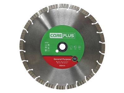 The CorePlus GP350 General-Purpose Hybrid Turbo Diamond Blade has the following specification: Diameter: 350mm Bore: 25.4mm Segment Height: 15mm Segment Width: 3.5mm