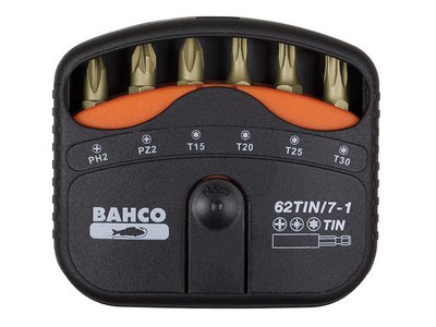 The Bahco 62TIN/7-1 7 Piece TiN Bit Set contains a selection of bits made from high-performance alloy steel with a titanium nitride finish. They are extremely wear resistant when used for high volume production and continuous use at normal torque levels. Supplied in a handy plastic storage case. Contains: 1 x 25mm Phillips Bit: PH2. 1 x 25mm Pozidriv Bit: PZ2. 4 x 25mm TORX Bits: TX15, TX20, TX25 and TX30. 1 x 1/4in Universal Bit Holder.