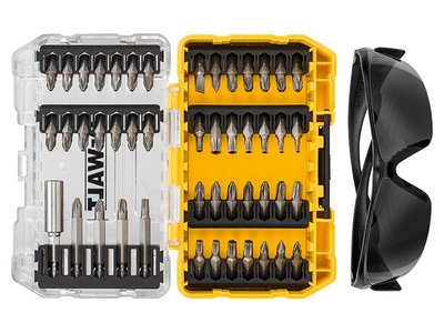 The Dewalt DT70703 Screwdriving Set is supplied in a TOUGH CASE+, this is part of a connectable case system that is TSTAK (TM) compatible. Individual TOUGH CASES can be clipped together for easy transportation. One pair of Tinted Safety Glasses are included. Contains: 1 x 25mm Slotted Bit: 6mm. 8 x 25mm Phillips Bits: PH1, PH2(x5) and PH3(x2). 22 x 25mm Pozidriv Bits: PZ1(x3), PZ2(x14) and PZ3(x5). 5 x 25mm TORX Bits: TX20, TX25(x2) and TX30(x2). 6 x 25mm TORX Security Bits: TX10, TX15, TX20, TX25, TX30 and TX40. 1 x 50mm Phillips Bit: PH2. 2 x 50mm Pozidriv Bits: PZ2 and PZ3. 1 x 50mm TORX Bit: TX25. 1 x Bit Holder.