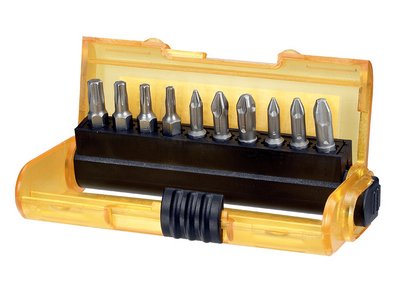 The Dewalt DT7916 ;Screwdriver Bit Set includes a selection of tough, professional quality screwdriver bits. The bits have a hardened core for strength and durability with Extra Grip ribs to grip the screw and reduce slippage. Contains: 3 x 25mm Phillips Bits: PH1, PH2 and PH3. 3 x 25mm Pozidriv Bits: PZ1, PZ2 and PZ3. 4 x 25mm TORX Bits: TX10, TX15, TX20 and TX25. 1 x Magnetic Bit Holder.