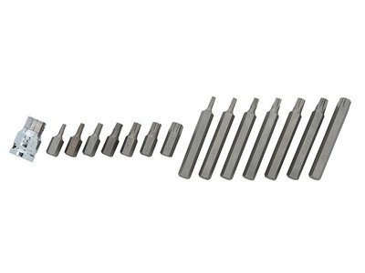 The BlueSpot TORX Bit Set contains a selection of bits, drop forged from heat treated chrome vanadium steel for increased durability. Suitable for hand and power tools. Complete with handy carrying case for quick and easy storage. Contains: 7 x 30mm TORX Bits: TX20, TX25, TX30, TX40, TX45, TX50 and TX55. 7 x 75mm TORX Bits: TX20, TX25, TX30, TX40, TX45, TX50 and TX55. 1 x 1/2in Adaptor.