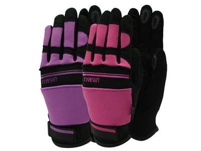 Town & Country Ultimax Ladies Gloves have been designed for carrying out heavy-duty tasks in maximum comfort. The palm of this glove is made from strong but supple synthetic leather and features textured palm pads for improved grip. With a neoprene knuckle shock absorber and reinforced fingertips. The elastane back provides an extremely close fit. **PLEASE NOTE** Colour selection is random, either Aubergine or Pink. ONLY one pair supplied.