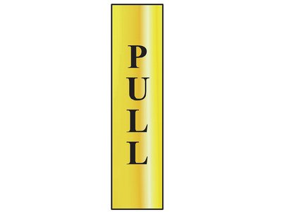 Polished brass effect self-adhesive sign with black text/graphic. Printed using UV resistant inks. Size: 50 x 200mm.