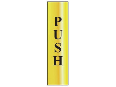 Polished brass effect self-adhesive sign with black text/graphic. Printed using UV resistant inks. Size: 50 x 200mm.