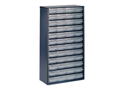 The Raaco 1248-01 Metal Cabinet has 48 drawers, each drawer can be divided into 16 compartments. The cabinet is made of painted steel and the drawers are made of polypropylene (PP). Drawers: 48 x 150-01 (41 x 67 x 153mm).