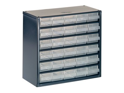 The Raaco 624-01 Metal Cabinet has 24 drawers, each drawer can be divided into 16 compartments. The cabinet is made of painted steel and the drawers are made of polypropylene (PP). Drawers: 24 x 150-01 (41 x 67 x 153mm).