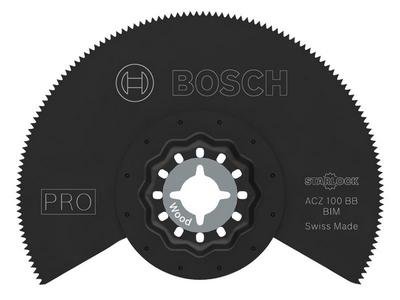 The Bosch PRO ACZ 100 BB Segment Blade is a professional level blade for wood work, the PRO ACZ 100 BB brings accuracy and quality of cutting to your multitool. Its ideal for making straight cuts on floorboards, panels, and frames. Made from Bi-Metal for strength and endurance. The large curve of the blade and the tooth geometry are optimised for making accurate, straight cuts in wooden building materials. The Starlock mount provides optimum power transfer and convenient blade change within 3 seconds. The mounting system produces the highest power transfer due to a 3-dimensional tight-fitting connection between machine and accessory. Specification: Diameter: 100mm