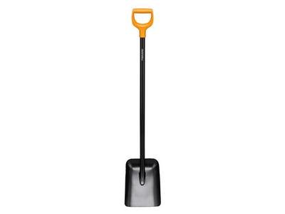 The Fiskars Solid (TM) Metal Shovel with a wide scoop for moving dirt, sand, gravel and other bulky materials. Its steel head is welded to a strong metal shaft for added durability. Fitted with a D-shaped handle fitting all hand sizes, with or without gloves. Fiskars Solid (TM) tools are effective, easy-to-use and offer affordable quality to get the job done.